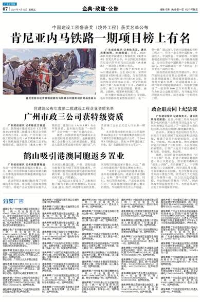广东建设报讯 记者陈克正报道:近日,住房城乡建设部发布《关于核准2024年度第二批建设工程企业资质名单的公告》。其中,广州市第三市政工程有限公司(以下简称市政三公司)被核准授予建筑工程施工总承包特级资质、建筑行业(建筑工程)甲级资质、建筑行业(人防工程)专业甲级资质,是本批次获准“一特双甲”企业中唯一一家广东省内企业。