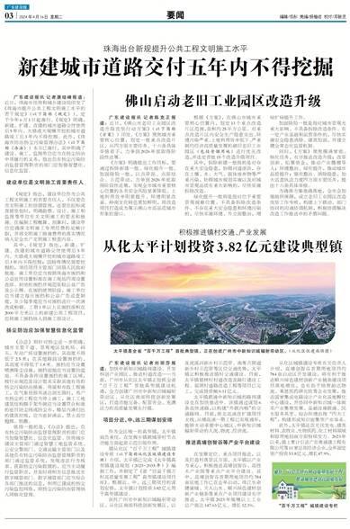 广东建设报讯 记者刘丽莎报道:加快中新知识城路网建设、开发科创产业园区、推进村道改造……当前,广州市从化区太平镇正抢抓全省“百千万工程”首批典型镇建设机遇,全力创建广州市中新知识城辐射带动区、从化区南部科技创新发展区,打造功能完备、配套齐全、充满活力的高质量发展先行镇。