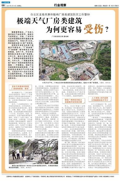 纵观近年来发生的多个极端天气事件中,“厂房被毁”“厂房倒塌”等字眼常见于媒体报道。去年7月,河北保定暴雨致20多间工地厂房被毁;今年2月,湖北公安县农贸市场、厂房等多处建筑被积雪压垮;今年4月,广西藤县某陶瓷厂部分厂房房顶被强风吹起塌落……不难看出,相较于住宅建筑等其他建筑类型,厂房类建筑在极端天气中更为脆弱。尤其在今年4月白云区发生龙卷风事件后,厂房类建筑的抗灾性能问题引发社会各界高度关注。