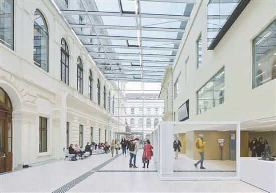 奥地利格拉茨大学图书馆是一栋原建于1895年的历史建筑,设计目标包括一个能够容纳430人的礼堂、650人的阅读与工作空间、学习和考试用房、行政管理办公室和学校的存储空间。更新设计的结果使图书馆焕然一新:双层高的玻璃盒子平台从历史建筑上方悬挑而出;新增的透明中庭作为公共空间,无缝连接图书馆与大学主楼等历史建筑,并将多年来不同风格的扩建、增建部分合为一个整体。新建筑不仅达到了21世纪图书馆设计的标准,还修复重现了原先图书馆和建筑历史的昔日光辉。