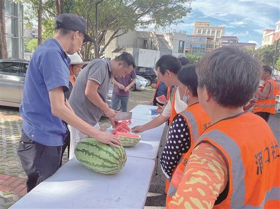 厚街城管分局也开展了关怀问候环卫工人活动。自7月以来,厚街城管系统共开展“夏日送清凉”主题慰问活动 10 场,不断为辖区环卫工人送上饮料、藿香正气水、面包、西瓜及草帽等慰问物品。
