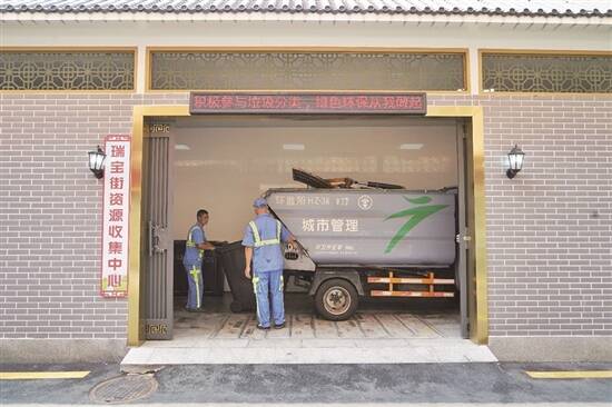 在瑞宝街资源收集中心,青砖、木色、飞檐翘角令建筑外观显得古色古香,大门右侧设有环卫工人休息区,门上的LED屏滚动播放垃圾分类宣传标语……“以前垃圾收储只是用绿皮桶随意地围着,污水横流,环境哪有现在这么整洁干净!”前来投放垃圾的居民马女士说道。她一靠近垃圾箱,投递口便自动打开,旁边还设有洗手池、烘干机,非常方便舒适。