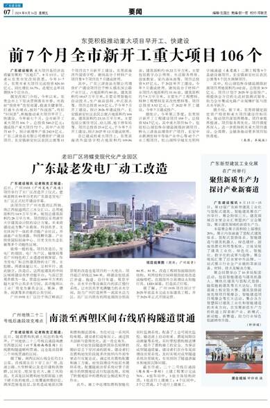据发改部门介绍,今年以来,东莞全市上下坚决贯彻落实市委、市政府“投资年”攻坚部署,提速关键事项、打通卡点堵点,挂好“作战图”,列好“时间表”,积极推动重大项目早开工、快建设。今年前七个月,全市新开工重大项目106个,总投资540.2亿元;建成投产重大项目72个,其中产业项目43个,预计新增年产值242.9亿元。广东三津食品有限公司增资扩产建设项目、长安镇新安社区农民公寓等11个项目在7月新开工建设,东莞滨海湾外国语学校、谢岗高分子材料产业项目等9个项目在7月建成使用。