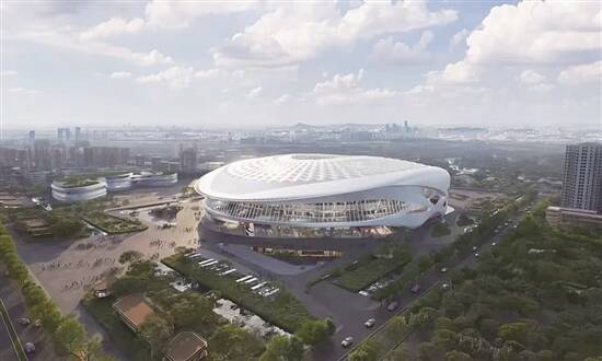 足球场馆以“瑞玉吉祥·生态玲珑”为设计理念,灵感源自“龙凤纹重环玉佩”,以及传承了两千多年的国家非物质文化遗产广州牙雕技艺。建筑曲线的流畅交错,展现了赛场的速度与力量,传达出广东在百舸争流新格局下赛龙夺锦的拼搏精神;玲珑形态与建筑造型的完美结合,展现出广州开放包容的姿态,彰显了岭南文化精神。场馆整体贴合城市尺度,营造宜人城市景观,建成后将成为广州建设体育名城的一张地标式新名片。