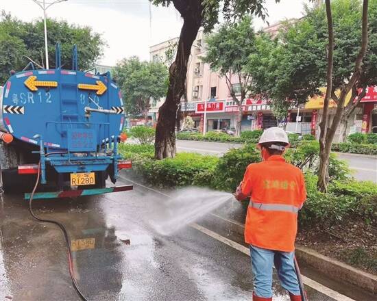洒水车在冲刷路面(东莞市城管局供图)