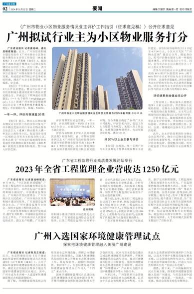 广东建设报讯 记者唐培峰、通讯员穗建报道:近日,广州市住房和城乡建设局发布《广州市物业小区物业服务情况业主评价工作指引(征求意见稿)》(以下简称《指引》),提出拟于2025年起开展物业小区物业服务情况业主评价工作,试行二年,试行期满结合工作开展情况再行完善。此举旨在推动广州物业服务行业高质量发展,形成质价相符和公平竞争的市场环境,增进广大业主的获得感、幸福感、安全感。