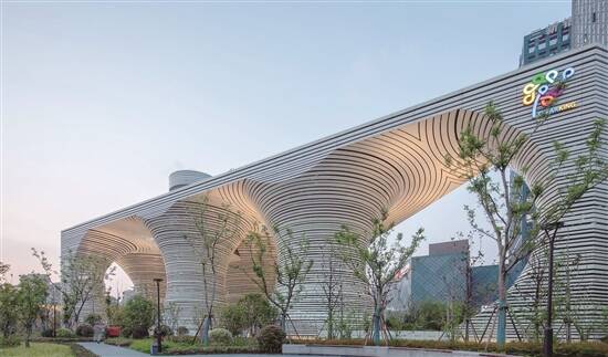 在江苏省昆山城市生态森林公园,有这样一个与环境融为一体的停车场,以木质外观和玻璃幕墙为主基调,车库的地上建筑(泊车厅)外立面设计成树状弧形。