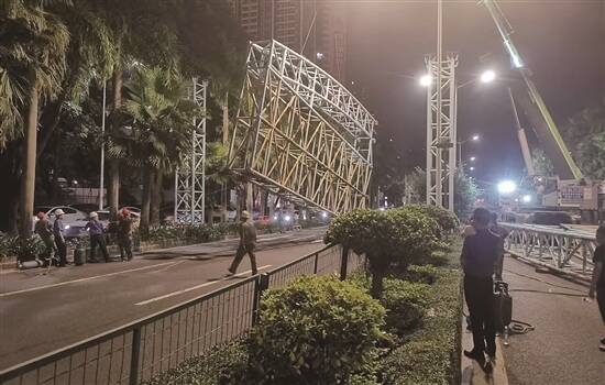 台风来临前,湛江城管拆除具有安全隐患的大型跨路龙门广告架(湛江市城管局供图)