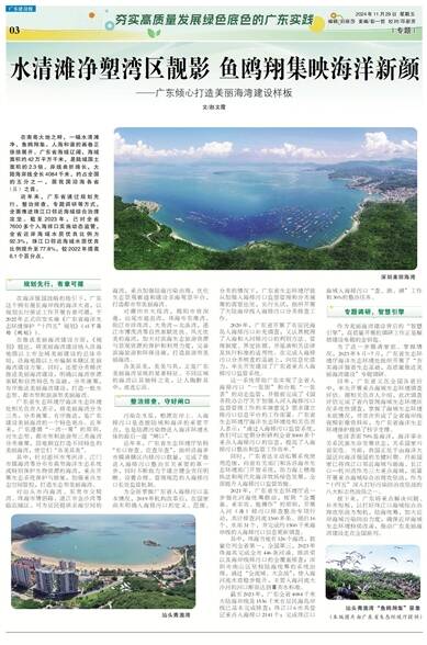 其中,珠海当地有126个海湾,数量位列全省第一,全国第三,2023年珠海共完成全市446条河涌、排洪渠以及海岸线排污口的全覆盖排查;深圳市南山区坚持陆海统筹的系统治理,通过“全流域、大会战”,使入海河流水质稳步提升,主要入海河流大沙河的河口断面达到Ⅲ类水标准。
