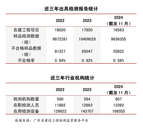 截至2022年底,我国获得资质认定的建筑工程质量检测机构超过13000家,全年实现营业收入约1354亿元。其中,广东省的建筑工程质量检测机构共607家,实现营业收入总额超过100亿元,位居全国首位。根据广东省建设工程检测监管服务平台2024年统计数据,全省607家检测机构中,检测技术人员超过1.3万人,检测设备超过16.9万台。截至11月底,2024年度全省共出具超过963.6万组样品的检测数据,为全省16563个在建工程项目排查出55822个质量不合格问题,有效保障了工程质量安全。