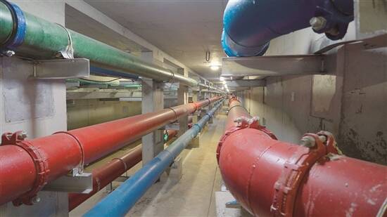 中山大学深圳校区位于深圳光明区,校区依山而建,场地起伏变化大,基岩外露,管线种类和数量多,而道路十分狭窄,经过深入论证,最终采用了经济集约型支线综合管廊。记者一行跟随鲁南通过集约的管廊人员出入口,沿着垂直爬梯,下到管廊内部,眼前的地下管廊别有洞天,各类管线有序排列,确保校园内科研、教学、生活等各项工作顺利开展。