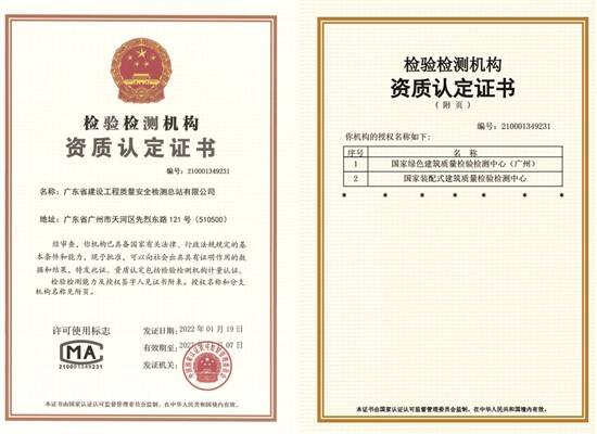 广东省建设工程质量安全检测总站有限公司检验检测机构资质认定证书