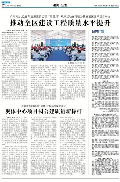 广东建设报讯 9月28日,由广东省住房和城乡建设厅、茂名市住房和城乡建设局主办,中国建筑第八工程局有限公司承办的2025年广东省住房城乡建设系统“质量月”分会场暨茂名市“质量月”现场观摩交流活动在茂名市奥林匹克体育中心项目举行。本次活动旨在树立工程质量标杆,推广先进管理经验,推动全市建筑业高质量发展。茂名市政府相关领导出席活动并致辞,市住建局、各区县住建部门、行业协会及全市重点在建项目施工、监理单位负责人等近500人参加观摩。