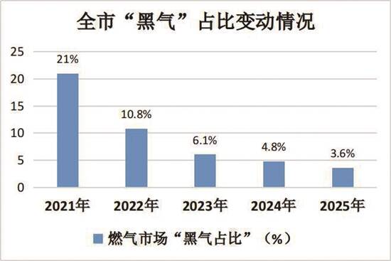 (二)“黑气”占有率持续下降。据东莞市正规气用户(瓶装气+天然气)及其它能源用户计算,2021年,东莞市“黑气”占比约21%,2022年为10.8%,2023年为6.1%,2024年为4.8%,2025年为3.6%,呈逐年下降趋势。目前东莞市“黑气”主要以东莞市正规燃气企业未落实入户安检的燃气为主。