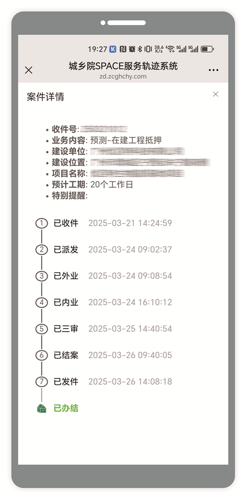 “服务轨迹系统让我们充分感受到了城乡院服务的专业、速度与温度。过去在其他地区办厂,要去现场查进度,现在手机实时查看,非常便利。办件速度效率很高,从收件到发件,不到一个星期就能完成。”客户黄先生表示,借助该系统,多项测绘业务办理效率显著提升。数据显示,该系统已服务产业项目完成600多项测绘相关业务流程,案件按时完成率从82%提升至99.5%,业务办理效率提升超18%。目前,服务号关注用户已达700余人,累计向200多位客户推送业务进度信息,有效缓解了企业等待焦虑。