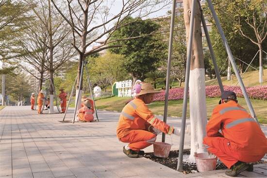 广东建设报讯 记者陈小珊,通讯员易鹏、廖静报道:12月13日,受中等偏强冷空气影响,广州气温持续下降并伴有小雨。为保护树木安全越冬,广州市白云区城市管理和综合执法局(以下简称白云区城管局)自12月初起,组织绿化工人对辖区内5.8万株树木进行涂白作业。一株株树木陆续穿上整齐的“白色冬衣”,与周围绿植相互映衬,成为冬日城市一道整洁而靓丽的风景线。