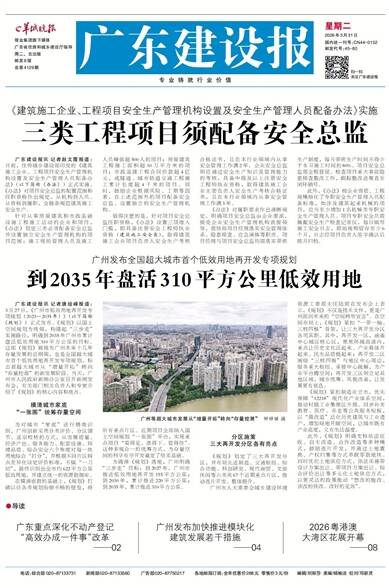 广东建设报讯 记者赵文霞报道:日前,住房城乡建设部印发的《建筑施工企业、工程项目安全生产管理机构设置及安全生产管理人员配备办法》(以下简称《办法》)正式实施。《办法》对项目安全总监的配置范围和任职资格作出规定,从机构到人员、从资格到履职,全链条规范建筑施工安全生产。