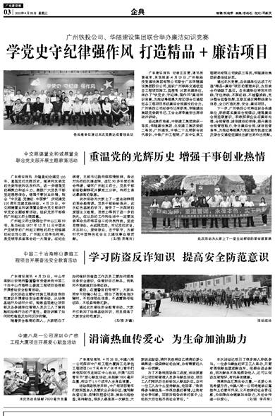 广东建设报讯 记者王亚雯,通讯员黄祖军、吴浪报道:4月19日,广州铁路投资建设集团有限公司联合广东华隧建设集团股份公司,组织广州铁路交通枢纽各工程项目施工、监理等16家共建单位,举办了“学党史