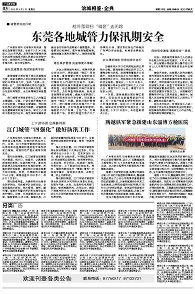 广东建设报讯 记者陈小珊报道:当前我省正值汛期,为做好防范应对工作,日前,江门市城市管理和综合执法局采取巡查清疏和值班值守等四项有力措施,有效防范严重水浸等灾情发生。 强化设