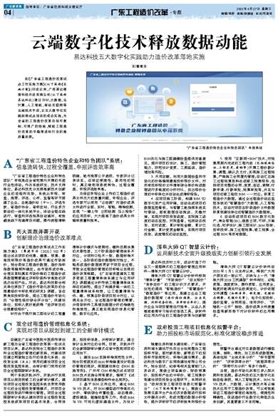 自《广东省工程造价改革试点工作实施方案》(以下简称《实施方案》)印发以来,广州易达建信科技开发有限公司(以下简称易达科技)通过BIM、大数据、云计算、人工智能、移动互联网等云端技术手