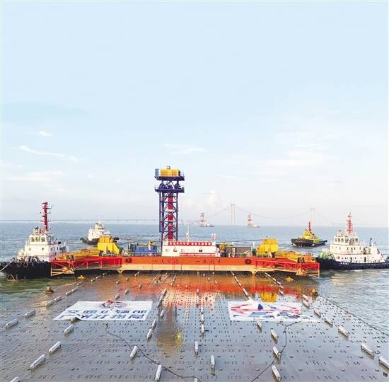 深中通道沉管隧道E25管节乘潮出发,前往隧址。 |
