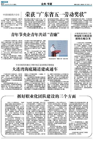 广东建设报讯 记者陈克正,通讯员肖明葵、房毅、郑淑琴报道:近日,2023年广东省庆祝“五一”国际劳动节暨五一劳动奖表彰大会召开,中交四航局六公司(以下简称公司)荣获“广东省五一劳