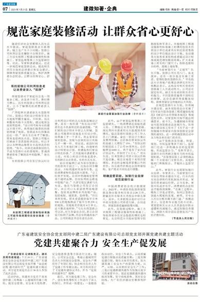 广东建设报讯 记者陈克正、通讯员周传建报道:7月19日,广东省建筑安全协会党支部同中建二局广东建设有限公司总部党支部开展“奋进新征程 建功新时代”党建共建主题活动。双方党支部党员合计30余人参加了此次活动。 活动伊始,共建双方党员干部来到中建二局粤海·云港城项目施工现场,就安全管理、安全重大危险源、安全隐患排查等方面进行交流;随后,公司安全总监、粤海云港城项目负责人分别就安全管理、安全生产情况作了专项汇报;协会相关负责人作了党建工作专题交流;双方共同签订了《党建共建协议书》,并为“党组织共建单位”揭牌。 最后,双方就党建工作、安全生产、创先争优等相关工作进行了深入的探讨,并形成一致意见:一是提高政治站位,突出工作重点,以高质量党建引领推动高质量发展;二是发挥党建引领,强化主体责任落实,加大建筑施工安全生产的管理力度,从严、从细、从实抓好安全生产工作;三是以党建联建共建作为加强交流学习的重要平台,促进党建联建共建向纵深发展,坚守底线思维、筑牢安全防线,为广东经济建设发展保驾护航。