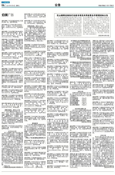 遗失声明 广州华杰服饰有限公司遗失公章一枚,现声明作废。 遗失声明 庄文平遗失营业执照正、副本,注册号:440105600949895,编号:S0592014023274G,现声明作废。 遗失声明 广州市花都区新华旺辉玉器加工店遗失营业执照正、副本,统一社会信用代码92440101MA5AENK443,注册号440121600178154,声明作废。 变更声明 广州市德创环保工程有限公司,股东由刘俊仁、蒋国鹏变更为蒋国鹏、张建新,法定代表人由刘俊仁变更为张建新,自办理工商登记变更之日前,公司所发生的一切债权债务由原股东、原法人承担,变更后公司所发生的一切债权债务由新股东、新法人承担。特此声明。 遗失声明 广州南木马服饰有限公司遗失营业执照正、副本,统一社会信用代码91440104MACHLDX8XN,注册号440104004138699,声明作废。 遗失声明 广州市花都区花东誉隆便利店遗失营业执照正、副本,统一社会信用代码:92440101MA5CWK2H88,现声明作废。 遗失声明 广州市赛厉斯机电有限公司遗失营业执照正、副本,统一社会信用代码9144010167181091XM,注册号4401032009018,声明作废。 撤销公告 籽然健康互联网医院(广州)有限公司撤销2022年10月19日、2022年10月19日在国家企业信用信息公示系统分别对外公示的清算组备案及债权人公告,并解散清算组。该公司继续经营,特此公告。 遗失声明 东莞市莫氏电子科技有限公司遗失公章一枚,现声明作废。 遗失声明 广州市蓝考拉眼科诊所有限公司遗失公章一枚,印章编码:4401130237103,现声明作废。 遗失声明 广州市越秀区辰叁服装商行遗失营业执照副本,统一社会信用代码92440101MA5AH6AC62,编号S0492016012607G,声明作废。 遗失声明 郦爱央遗失营业执照正本,统一社会信用代码:92440101MA5CD2U124,编号:S0392018011433G,声明作废。 清算组备案、债权人公告 广州市仟耀贸易有限公司,注册号:4401012035403,经股东会决议终止经营,现已成立清算组进行清算。清算组成员:余维军、吕海成,清算组负责人:余维军。请相关债权人自本公告见报之日起45天内向本公司清算组申报债权,逾期不申报,视为放弃权利。清算结束后,本公司将向登记主管机关申请注销登记。特此公告。 遗失声明 广州市知宜化妆品有限公司遗失公章、财务专用章各一枚,现声明作废。 公司分立公告 经广州番禺交通水电安装工程有限公司股东会决议,广州番禺交通水电安装工程有限公司拟派生分立为“广州番禺交通水电安装工程有限公司”和“广州市领程智能科技有限公司”(公司名称以工商登记为准)。分立前“广州番禺交通水电安装工程有限公司”注册资本为人民币4000万元,分立后的“广州番禺交通水电安装工程有限公司”注册资本为人民币4000万元,“广州市领程智能科技有限公司”注册资本为人民币100万元。分立后的广州番禺交通水电安装工程有限公司承担除用于新设公司设立的资产和负债外的全部资产与负债,或由广州番禺交通水电安装工程有限公司与债权人另行签订债务清偿协议。本公司债权人可自公告之日起四十五日内,要求公司对债务承继方案进行修改,或者要求清偿债务或提供相应的担保。本公司债权人未在规定期限内行使上述权利的,公司分立将按照法定程序实施。 特此公告 广州番禺交通水电安装工程有限公司 遗失声明 肖长安遗失营业执照正本,注册号:440103600912476,编号:S0392016000089G,现声明作废。 遗失声明 肖长安遗失营业执照正本,注册号:440103600699566,编号:03913020980G,现声明作废。 清算组备案、债权人公告 广州粤尚君营销策划管理有限公司,统一社会信用代码:91440101304365375F,经股东会决议终止经营,现已成立清算组进行清算。清算组成员:刘志磊、王萍、李俊平,清算组负责人:刘志磊。请相关债权人自本公告见报之日起45天内向本公司清算组申报债权,逾期不申报,视为放弃权利。清算结束后,本公司将向登记主管机关申请注销登记。特此公告。 遗失声明 广州米勒医疗科技有限公司遗失营业执照正本,统一社会信用代码:91440101MA5AND7D7H,现声明作废。 遗失声明 广州市花都区新华凤萍服装店遗失营业执照正本,注册号:440121600790227,编号:S2192014025717G,声明作废。 债权人公告 广州粤潮装饰工程设计有限公司(统一社会信用代码:91440101MA5CKD0U76)经股东会决议终止经营,拟向公司登记主管机关申请注销登记。请相关债权人自本公告见报之日起45天内向本公司清算组申报债权,逾期不申报,视为放弃权利。特此公告。 遗失声明 杨丽容遗失营业执照正、副本,统一社会信用代码:92440101MA5CMKGT02,注册号:440104603269429,现声明作废。 遗失声明 广州市越秀区佳衣服装商行遗失营业执照正、副本,注册号440104603269412,统一社会信用代码92440101MA5CMKGQ6J,声明作废。 遗失声明 广州市越秀区爆爆宁服装商行遗失营业执照正、副本,注册号440104603269437,统一社会信用代码92440101MA5CMKH18N,声明作废。 遗失声明 叶东伟遗失营业执照正、副本,统一社会信用代码:92440101MA5A1LWP6W,注册号:440105600171511,现声明作废。 遗失声明 广州市白云区人和初哥食杂档遗失营业执照正、副本,统一社会信用代码92440101MA5AA1QLXN,注册号440111600951415,声明作废。 遗失声明 广州市花都区花东艾康养生馆遗失营业执照正、副本,统一社会信用代码:92440101MA5D4A971P,现声明作废。 遗失声明 广州市花都区秀全俊美日用品商店遗失公章、财务专用章、法人(唐志)私章各一枚,现声明作