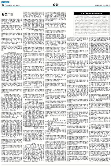 遗失声明 广州市起航文化有限公司遗失公章、合同专用章、发票专用章、旧法人(刘晓珊)私章各一枚,现声明作废。 遗失声明 佛山市禅城区暖柠水果饮品店遗失营业执照正、副本,统一社会信用代