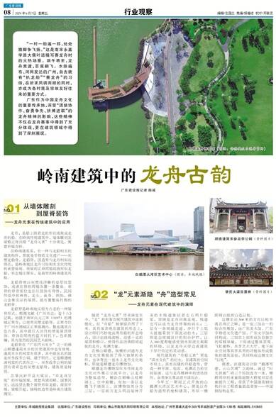 广东建设报记者 陈诚 “一村一船遍一邦,处处旗脚争飞扬。”这是南宋永嘉学派大儒叶适描写赛龙舟时的火热场景。端午将至,龙舟竞渡,百桨翻飞。水脉遍布、河网发达的广州,自古就有“扒龙船”“赛龙舟”的习俗,在祈求风调雨顺的同时,亦成为各村落及宗族友好往来的重要方式。 广东作为中国龙舟文化的重要传承地,深受“团结协作、奋勇争先、拼搏进取”的龙舟精神的影响,这些精神不仅在龙舟赛事中得到了充分体现,更在建筑领域中得到了深刻展现。 从墙体雕刻到屋脊装饰 ——龙舟元素在传统建筑中的应用 龙舟,是船上画着龙的形状或做成龙形的船。在岭南传统建筑中,墙体雕刻及屋檐正脊点缀“龙舟元素”十分常见,寓意祈福吉祥。 在岭南建筑里,有一种与龙船相关的建筑构件,那就是非物质文化遗产——灰塑龙船脊。龙船脊,因造型与龙舟相似而得名,是岭南地区龙舟习俗和水文化传统的重要体现。房屋的正脊两端高跷形似龙船,形态端庄厚实,是典型的岭南建筑风格。 龙船脊常以灰塑浅浮雕的卷草纹装饰,或者在脊的两端各置一条鳌鱼。垂脊的脊首部位也往往装饰有脊兽,民间传说中的神兽,龙头、鱼身。例如,佛山金紫名宗的屋顶,就有置鳌鱼托脚的龙船脊。 龙船脊是岭南地区较为古老的一种屋脊形式。根据文献《广州市志:卷十六》记载,始建于南宋庆元三年(1197)的增城正果寺,已使用灰塑龙船脊。正果寺位于广州市增城区正果镇辖内,整座建筑古色古香,其中最引人注目的便是屋顶脊饰。脊饰在明亮的蓝天衬托下,色彩斑斓,具有浓烈的民间艺术韵味。 龙船脊在“广东四大水乡”之一的佛山顺德逢简水乡的历史建筑中也有体现。逢简水乡的祠堂有很多,其中最出名的就是宋参政李公祠,建于明代,它是顺德晚清祠堂的代表作之一。宋参政李公祠的屋顶有着彩色的灰塑龙船脊,建筑很是特别。 在肇庆封开县大梁宫,“双龙戏宝瓶”的祈福图案,寓意风调雨顺、国泰民安,远远望去整个屋脊形似龙船,屋面平缓,屋檐升起,独特的造型是岭南古建筑瑰宝。 “龙”元素渐隐 “舟”造型常见 ——龙舟元素在现代建筑中的演绎 随着“龙舟元素”传承演变至今,“龙”的形象在现代建筑中逐渐弱化,而“舟船”被保留沿用了下来。其具体表现在建筑的形态上,设计师们巧妙地运用舟船的形态特点,设计出曲线流畅、动感十足的屋顶和檐口,使得作品仿佛即将起航的龙舟,充满力量。 在佛山顺德,纵横的河道为龙舟文化发展提供了得天独厚的条件,也孕育出一座水上龙舟文化地标,那就是顺德龙舟博物馆。 顺德龙舟博物馆作为传统龙舟文化对外展示交流平台,以龙舟为整体造型,横卧在顺峰山桂畔湖上,空中俯瞰,宛如一条巨龙腾飞于湖面上。该博物馆共分为三层:一层前方龙头两边延伸开来的木栈道象征着左右两片船桨,旁侧是龙舟训练基地,栈道也可以成为龙舟停靠的码头;二层有一条玻璃走道,步行于上低头就能看到下面流动的水;三层则是全玻璃设计的阳台护栏,让人360度都能感受到水面波光粼粼的环绕,以及龙舟从旁边或建筑下穿行而过的灵动感。 现代建筑的“舟船元素”更是“滨水文化”的衍生。在建筑的空间布局上,滨水而建的舟船造型,营造一种开放、包容、充满活力的空间氛围。这与龙舟精神中的团结协作、奋勇争先等品质不谋而合。 今年五一期间正式开放的白鹅潭大湾区艺术中心,便是以舟船为造型的地标建筑,形似一艘即将启航的白色巨轮。 这艘长近360米的文化巨轮坐落在珠江之畔,是一座三馆合一的综合性展馆,由广东美术馆、广东非物质文化遗产馆、广东文学馆共同构成。三馆在上部形成各自独立的塔楼体量,下部通过整体景观、飞虹廊桥、共享艺术大厅、地下商业空间等共享共用的功能体形成整体的建筑基座,共同构成这艘文化“巨轮”。 据悉,该建筑设计取“鹅潭写意,云山艺境”之韵味,通过“时光拱廊”将三个场馆连为一体,横跨两岸的重量级超限大跨度双层连廊提升工程,荣获了中国建筑钢结构行业工程质量最高荣誉——中国钢结构金奖。