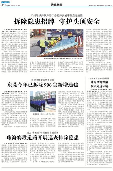广东建设报讯 记者钟梓骥,通讯员成广聚、吴超报道:户外广告和招牌是城市形象的展示,关乎市民群众“头顶上的安全”。11月1日,广州市增城区城市管理和综合执法局连同相关镇街,在辖区内