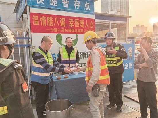 广东建设报讯 记者陈克正,通讯员周传建、李佩琳报道:1月7日,中建二局(广东)建设有限公司名创优品国际总部项目开展“温情腊八粥 幸福暖人心”活动。 活动现场,名创优品国际总部项目在工地门口摆起了免费腊八粥畅饮摊点,项目志愿者正在为工友们准备碗筷、盛舀粥食,一旁正在品尝腊八粥的工友们脸上洋溢着笑容。 据悉,该项目为广州市重点建设工程,为确保项目节点顺利完成,早日投产使用,项目创新引入轻量化造楼机进行竖向结构施工,该造楼机采用导轨-桁架-钢平台的轻量化整体桁架设计,有助于提升超高层建造水平,加快项目建设步伐。 目前,项目正处于主体结构施工阶段,预计春节前将完成核心筒封顶。