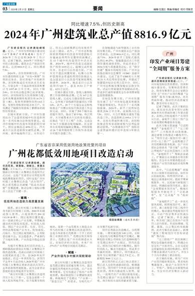 广东建设报讯 记者唐培峰报道:近日,广州市住房和城乡建设局(以下简称广州市住建局)发布了2024年工作总结和2025年工作计划。记者了解到,2024年广州房地产市场止跌回稳,建筑业总产值创历史新高,达到8816.9亿元,同比增速7.5%。 2024年,在住房保障方面,广州市住建局持续完善“市场+保障”住房供应体系。面对房地产市场新形势,该局积极适应市场供求关系变化,尽管全年一手商品房网签面积累计为1097.49万平方米,同比下降2.8%,但市场企稳态势已初步显现。同时,该局持续加大住房保障力度,全年共筹建保障性租赁住房10.79万套(间)、配售型保障性住房1.02万套,发放住房租赁补贴2.19万户,有效满足了城镇住房困难工薪群体的刚性住房需求。 在城市更新方面,广州市住建局出台了全国首部城中村改造条例及一系列实施办法和指导意见,成功申报城中村改造专项借款项目52个,授信金额高达4096亿元。四大重点片区改造取得突破性进展,罗冲围、新中轴海珠片区、火车站片区、环五山创新策源区均实现首开区动工建设。此外,广州市还积极探索使用城中村改造专项借款购买存量商品房用作安置房的新模式,在13个城中村改造项目中试点实施。2024年,城中村改造完成固定资产投资1035亿元,超额完成年度任务。在老旧小区改造方面,广州市关于盘活闲置房屋、拓展小区维护管理资金渠道的两项经验做法入选全国老旧小区改造可复制政策机制清单。2024年,推进老旧小区改造项目523个,惠及19.53万户家庭、62.5万居民。 在城乡建设方面,管线入廊和收费工作取得积极进展,已有167公里管线入廊,完成电力建设投资119亿元,全年地下管线破坏数量同比下降14%。此外,20个十五届全运会和残特奥会广州赛区场馆升级改造工作全面完成。同时,实施了295个城市品质提升项目,推动了新中轴、珠江两岸、大学城等重点片区的优化建设。在推进“百千万工程”方面,完成全市34个乡镇建设规划编制,在全省率先实现规划编制全覆盖,并持续推动26个典型镇培育工作和71条美丽乡村提升创建工作。 在智能建造与新型建筑工业化协同发展方面,广州市建筑业总产值创历史新高,达到8816.9亿元,同比增速7.5%。2024年新开工装配式建筑比例达49.27%。智能建造试点工作获得住建部通报表扬,并成功承办了2024内地与香港建筑论坛。在“数字住建”整体布局规划方面,广州市全面推进城市信息模型(CIM)基础平台建设,完成了基于CIM的七大领域21大类应用场景拓展,并建成了智慧琶洲综合应用示范平台。同时,广州市还积极发展智能安居数字住房,试运行房屋建筑单体赋码系统,并逐步打通房屋建筑全生命周期审批监管数据链条。 在绿色发展方面,广州市住建局实施了《广州市绿色建筑和建筑节能管理规定》,并出台了一系列激励措施。2024年,新开工民用绿色建筑2136万平方米,高星级占比达72%。同时,大力开展既有建筑节能改造工作,改造面积达695.6万平方米。在优化营商环境方面,该局持续推进告知承诺制审批与信用监管联动管理,“办理建筑许可”指标在全省营商环境评估中连续3年排名第一。