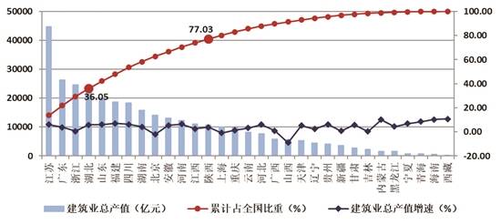 近日,中国建筑业协会发布《2024年建筑业发展统计分析》。统计数据显示,全国建筑业企业完成建筑业总产值326501.11亿元,同比增长3.85%;完成竣工产值135238.80亿元,同比降低1.65%;签订合同总额727219.17亿元,同比下降0.22%,其中新签合同额337500.52亿元,同比下降5.29%;房屋建筑施工面积136.83亿平方米,同比减少10.62%;房屋建筑竣工面积34.37亿平方米,同比减少12.63%;实现利润7513亿元,按可比口径计算,比上年下降9.8%。 截至2024年底,全国有施工活动的建筑业企业168011个,同比增长5.57%;直接从事生产经营活动的平均人数5962.07万人,同比减少12.26%;按建筑业总产值计算的劳动生产率为547630元/人,同比提高15.15%。 江苏总产值以绝对优势领跑全国 2024年,江苏建筑业总产值达到44771.49亿元,以绝对优势继续领跑全国。广东、浙江、湖北3省的建筑业总产值也都超过了2万亿元,分列第二、三、四位。4省建筑业总产值共占全国建筑业总产值的36.05%。除这4省外,总产值超过1万亿元的还有山东、福建、四川、湖南、北京、安徽、河南、江西、陕西等9个省市,上述13个地区完成的建筑业总产值占全国建筑业总产值的77.03%。 从各地区建筑业总产值增长情况看,28个地区建筑业总产值保持增长,西藏、海南、内蒙古分别以10.80%、10.31%、10.11%的增速位居前三位;山西、北京、上海等3个地区建筑业总产值出现下滑,其中山西的降幅超过9%。 2024年,江苏建筑业实现竣工产值29235.43亿元,比上年增长1.11%,稳居首位。浙江建筑业实现竣工产值13283.58亿元,比上年减少5.72%,排在第二位。竣工产值超过5000亿元的还有广东、北京、湖北、福建、湖南、山东、四川、上海等8个地区。竣工产值增速超过10%的有海南、青海、宁夏、内蒙古、广东、天津、新疆等7个地区,17个地区的竣工产值出现负增长,其中湖北、山西、辽宁的降幅均超过15%。 23个地区在外省完成产值增长 2024年,在外省完成的产值排名前两位的仍然是江苏和北京,分别为19140.34亿元、10027.20亿元。两地区在外省完成产值之和占全部在外省完成产值的比重为26.21%。湖北、福建、浙江、广东、上海、湖南、山东等7个地区在外省完成的产值均超过5000亿元。从增速上看,23个地区在外省完成产值保持增长,云南、浙江的增速均超过15%。8个地区在外省完成产值下降,山西出现了超过10%的负增长。 从外向度(即本地区在外省完成的建筑业产值占本地区建筑业总产值的比例)来看,排在前三位的地区仍然是北京、天津、上海,分别为71.48%、69.28%和53.33%。外向度超过30%的还有福建、江苏、湖北、陕西、青海、河北、山西、贵州、辽宁、湖南等10个地区。有15个地区的外向度出现负增长,其中西藏、黑龙江、新疆的降幅均超过10%。 广东签订合同总额继续排榜首 2024年,广东建筑业企业签订合同总额继续排在首位,达到71923.51亿元,比上年减少5.11%;江苏以63199.53亿元排在第二位,比上年减少1.53%。两省签订的合同总额占全国签订合同总额的18.58%。签订合同总额超过3万亿元的还有湖北、北京、浙江、四川、山东、上海、福建、湖南等8个地区。18个地区签订合同总额比上年增长,增速超过10%的有西藏、海南、宁夏、天津等4个地区,13个地区签订合同总额出现负增长。 2024年,江苏建筑业企业新签合同额达到38249.48亿元,比上年增长1.88%。新签合同额超过2万亿元的还有广东、湖北、浙江、山东等4个地区。新签合同额增速超过10%的有西藏、宁夏、黑龙江、海南等4个地区,19个地区新签合同额出现负增长,其中青海、陕西、四川新签合同额出现了超过15%的负增长。 六省建筑业企业数量超1万家 2024年,江苏、山东、广东、浙江、河南、四川六省建筑业企业数量超过1万家。企业数量超过5000家的还有福建、安徽、江西、湖北、辽宁等5个地区。企业数量增速超过35%的是西藏、海南、青海等3个地区。北京、吉林2个地区企业数量出现负增长。 2024年,建筑业直接从事生产经营活动平均人数超过百万的有18个地区。江苏直接从事生产经营活动平均人数位居首位,达到1005.52万人。浙江、福建、四川、广东、山东等5个地区直接从事生产经营活动平均人数均超过300万人。与上年相比,黑龙江直接从事生产经营活动平均人数增加11.42万人,其余30个地区直接从事生产经营活动平均人数减少,其中,江苏减少120.13万人、浙江减少76.89万人、江西减少75.82万人。黑龙江以29.67%的直接从事生产经营活动平均人数增速排在第一位;江西、吉林、陕西、广西、贵州等5个地区直接从事生产经营活动平均人数均出现了超过20%的降幅。 2024年,按建筑业总产值计算的劳动生产率排序前三位的地区是湖北、海南和青海。湖北为846625元/人,比上年提高20.05%;海南为780617元/人,比上年提高32.81%;青海为747003元/人,比上年提高32.81%。30个地区劳动生产率提高,其中,吉林、贵州、陕西、海南、青海、甘肃等6个地区的增速均超过30%;黑龙江的劳动生产率降低了19.57%。 29个地区房屋建筑施工面积下降 2024年,江苏、浙江、广东建筑业企业的房屋建筑施工面积均超过了10亿平方米,分别为23.95亿平方米、15.07亿平方米和10.98亿平方米,分别比上年降低7.60%、10.32%、6.89%。山东、北京、湖南、福建、湖北、四川、上海、河南、安徽等9个地区的房屋建筑施工面积超过了5亿平方米。天津、湖南2个地区的房屋建筑施工面积比上年增长;29个地区