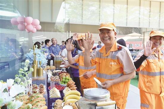 环卫工人在驿站内享用茶歇(图源:东莞市城管局) |
