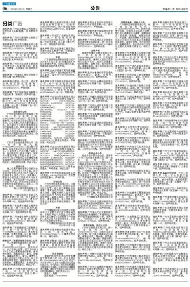 遗失声明 广州金云建筑工程有限公司遗失法人私章(唐健)一枚,现声明作废。 遗失声明 广州中乌教育科技有限公司遗失公章1枚,声明作废。 遗失声明 连州市连州镇高堆村大巷口经济合作社遗失开户许可证,号码44001761201053005270,声明作废! 遗失声明 广州钜获货运代理有限公司(统一社会信用代码:91440101MA9WE5YGXT)遗失营业执照正副本,声明作废。 遗失声明 广州乐乐运动俱乐部有限公司遗失法人私章(程会培)、财务章、发票章、合同章各1枚,现声明作废。 遗失声明 广州海珠区得日贸易商行遗失公章1枚,声明作废。 遗失声明 经营者:杨土芳,遗失营业执照正副本,注册号:440105600097447,旧注册号:440105312010433,声明作废。 遗失声明 广东仁骏新型材料有限公司遗失私章(彭康武)现声明作废。 遗失声明 广州诚誉人力资源管理有限公司(统一社会信用代码:91440101MA5D5GPN6C)遗失法定名称章,法人章(邓振辉)各一枚,现登报声明作废。 股东提示公告 广州拉普拉斯投资控股有限公司(统一社会信用代码:91440106MAC70GQH31)因公司变更事项,依法在本公司会议室召开股东会。公司负责人已多次履行通知义务,但仍联系不上股东:海南南洛投资控股有限公司。限其自本通告刊登之日起十五日之内, 2025年5月25日前来公司处理相关事宜,逾期我公司将视为同意股东会决议的决定,按相关规定处理,特此公告。 股东提示公告 广州苏亚石油设备有限公司(统一社会信用代码:91440101MA5D65L83U)因注销公司事项,依法在本公司会议室召开股东会。公司负责人已多次履行通知义务,但仍联系不上股东:代海宁。限其自本通告刊登之日起十五日之内,2025年5月24号前来公司处理相关事宜,逾期我公司将视为同意股东会决议的决定,按相关规定处理,特此公告。 减资公告 佛山亿晨苏建材有限公司股东会议决定,自2025年5月8日起,将公司原注册资本人民币100万元减少至注册资本人民币1万元。如有异议,请自本公告见报之日起45天内向本公司提出。本公司自第一次公告见报之日起45天后,将依法向企业登记主管机关申请变更登记。联系人:刘文发,电话:18002246082。 佛山亿晨苏建材有限公司 2025年5月9日 遗失声明 广州矗立埃菲尔婴幼儿托育服务有限公司(统一社会信用代码:91440101MA59K81CXL)遗失财务专用章一枚,现登报声明作废。 遗失声明 广东省勇兴建筑工程劳务有限公司(统一社会信用代码:91440112MACQLQKX5D)遗失财务专用章一枚,现登报声明作废。 遗失声明 广州海睿生物科技有限公司(统一社会信用代码:91440101MA59PHYJ9H)遗失公章一枚,现登报声明作废。 遗失声明 广东竞鹏建设工程有限公司(统一社会信用代码91440300MA5HADCE2G)遗失财务专用章、发票专用章、法人章(游忠智)各一枚,现登报声明作废。 解散公示、清算组备案及债权人公告 中山市徽邦电器有限公司(统一信用代码:91442000MA551P2H64),经股东决议,本公司停止经营,现于2025年5月8日已成立清算组进行清算,清理债权债务。清算组成员:童川、梁敏婷。清算组负责人:童川。请债权人自本公告见报之日起45天内,向公司清算组申报债权。逾期不申报,视为放弃权利。清算结束后,本将向登记主管机关申请注销登记。特此公告。 遗失声明 广州锦牧商贸有限公司(统一社会信用代码91440300359411092B)遗失公章一枚,现登报声明作废。 遗失声明 衢州众辰商贸有限公司遗失营业执照正副本。注册号:330802000030342,统一社会信用代码:91330802MA28F3454G,现登报声明作废。 遗失声明 广州诚艺广告策划有限公司(统一社会信用代码91440101MA9UQRWG01)遗失公章,财务专用章,法人章(黄汉杰)各一枚,现登报声明作废。 遗失声明 深圳市弘源泰工程有限公司遗失法定名称章一枚,印章编码: 4403071821649,现声明作废。 声明 广东森芮新能源科技有限公司于2025年4月22日在《广东建设报》刊登公章遗失声明,现因公章已找到,特撤销原刊登的遗失声明。 遗失声明 汕头市澄海区黄刘锋食品店(个体工商户)遗失食品经营许可证正副本,编号JY14405150268408,声明作废 遗失声明 东莞市美居信息科技有限公司(统一社会信用代码91441900MA56Y7DT6D)遗失法定名称章(4419570005860)合同专用章(4419570005861)财务专用章( 4419570005862)各一枚,声明作废 遗失声明 中企动力科技股份有限公司汕头分公司遗失销售合同编号:NCE15B-YM/TY0006594、NCE16B-YM0013152、NCE17A-YM0001676、NCE17B-QWMH0004427、NCE17B-DBT0004460、NCE17C-YDMH0000152、NCE17B-YM0001569、NCE17C-YM0029258、NCE18B-YM0014663、NCE18B-QWMH0005552、NCE18D-HT-0003301、NCE18D-HT-0003302、NCE19B-QQYZYB0001138、NCE19B-MHYXYSMH0007795、NCE19B-YM0006977、NCE19D-YM0005895、NCE19D-YM0005878、NCE19D-YM0005880、NCE19C-YM0006276、NCE19A-MHYWM-SX0002134以上销售合同遗失,声明作废,特此公告! 遗失声明 中企动力科技股份有限公司汕头分公司遗失销售合同编号:NCE19C-MHYXYSMH0004342、NCE19B-QQYZYB0001016、NCE20C-MHYQQMH0007225、NCE20B-YM0005602、NCE20D-MHYQQMHGJ0005457、NCE21A-MHYQQMHGJ0003643、NCE21A-MHYQQMHBZ0003023、NCE21D-QQMH(2022)GJ0003660以上销售合同遗失,声明作废,特此公告! 遗失声明 广州市华柏家具有限公司(注册号:440106000938782)遗失营业执照正副本,声明作废。 注销公告 广州市华柏家具有限公司,注册号:440106000938782,经股东会决议终止经营,现已成立清算组进行清算,清算组成员刘威,清算组负责人刘威。请相关债权人自本公告见报之日起45天内向本公司清算组申报债权,逾期不申报,视为放弃权利,