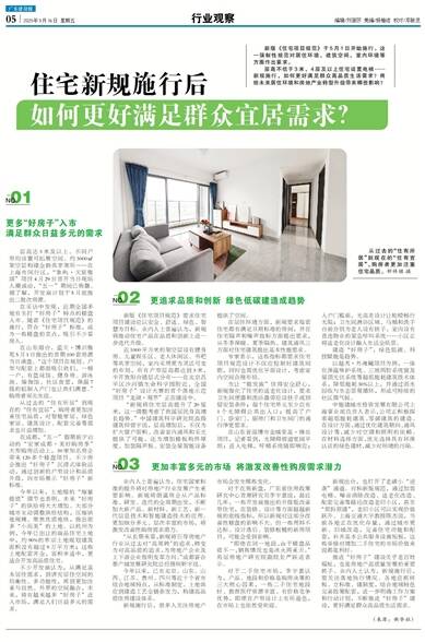 新版《住宅项目规范》于5月1日开始施行。这一强制性规范对居住环境、建筑空间、室内环境等方面作出要求。 层高不低于3米、4层及以上住宅设置电梯……新规施行,如何更好满足群众高品质生活