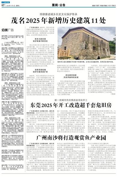 广东建设报讯 2025年,茂名市住房和城乡建设局积极作为,在历史文化保护传承领域取得系列显著进展。全市保护体系不断完善,资源挖掘与认定持续推进,活化利用实践亮
