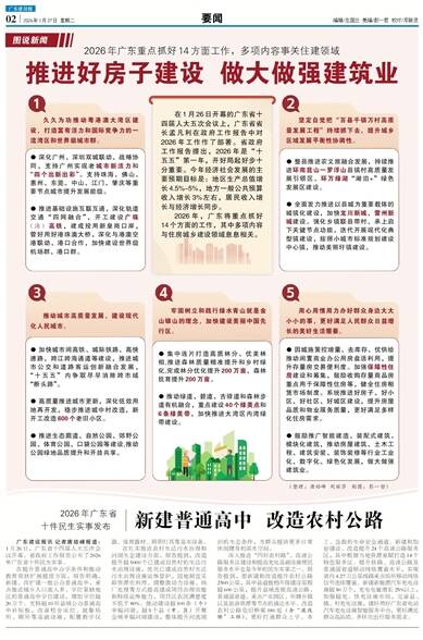 广东建设报讯 记者唐培峰报道:1月26日,广东省十四届人大五次会议开幕。省政府工作报告公布了2026年广东省十件民生实事。 在提升普通高中办学条件和推动教育帮扶扩围提质方面