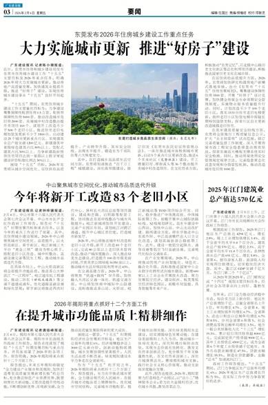 广东建设报讯 记者陈小珊报道:近日,东莞市住房和城乡建设局发布东莞市住房城乡建设工作“十五五”主要目标及2026年重点任务,明确2026年将大力实施城市更新,推动房地产高质量发展,加快建筑业提质升级,推进“好房子”建设,实现住房城乡建设事业“十五五”良好开局起步。 “十五五”期间,东莞住房城乡建设工作主要量化目标为:力争建设筹集保障性租赁住房1.5万套、配售型保障性住房5000套。推动改造城市危旧房2000套。实施城中村改造整治提升类项目160个。谋划开工改造不少于500个老旧小区,推进住宅老旧电梯加装及更新不少于3500台。启动建设25个城市更新重点片区。实现建筑业总产值突破1200亿元。新建建筑中星级绿色建筑占比80%以上、装配式建筑占比50%以上。力争新建政府投资住宅项目达到一星级以上数字家庭建设评价标准比例达30%以上。 围绕“十五五”目标,2026年东莞将从城乡空间优化、居住供给品质提升、产业转型升级、筑牢安全防线、治理水平提升、锻造有为干部队伍等六大维度发力。 其中,在打造城乡高品质生活空间方面,东莞将加速推进“百千万工程”城镇建设,深化典型镇建设,修订印发《东莞市农民安居房管理办法》。一体化推进城市体检和城市更新,启动5个重点片区更新改造,推进6个未来社区(完整社区)建设。开工塘厦旧圩、厚街溪头等36个整治提升类城中村改造项目。在文化传承方面,积极推动“东莞记忆”、石龙镇中山路历史文化街区等活化利用项目建设,积极推进国家历史文化名城申报。 在居住供给品质提升方面,2026年,东莞将加快研究构建房地产新模式落地举措,出台《东莞市“十五五”住房发展规划》,筹集建设保障性住房3500套。开展“好房子”设计竞赛,加快健全房屋全生命周期安全管理制度,实施物业服务质量提升行动。同时,计划改造不少于100个老旧小区,落实3333台住宅老旧电梯更新,组织老旧小区加装电梯申报超长期特别国债支持,探索片区自主更新改造城镇老旧住宅。 在筑牢建筑质量安全防线方面,东莞将全面推行工程质量信息公示,扩大“业主预看房”试点范围,修订完善质量监督工作制度。深入开展房屋市政工程安全隐患排查治理攻坚战,探索实施高大模板支撑系统实时安全检测。同时,推动房屋使用安全管理规定规章立法,完善隐患常态化巡查发现和分级管控机制,推动改造城市危旧房1000套。