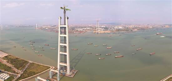 广东建设报讯 记者钟梓骥报道:3月26日11时许,粤港澳大湾区核心枢纽工程——狮子洋通道的关键控制性工程狮子洋大桥东、西主塔正式封顶,标志着大桥建设取得里程碑式突破,全面转入上部结构施工阶段。 狮子洋大桥采用2180米主跨“一跨过江”方案,两座主塔均高达342米,约合110层楼高,不仅是珠江口第一高桥塔,更是目前世界最高的双层悬索桥主塔。大桥采用上下双层共16车道设计,通行能力较单层桥梁提升一倍,建成后将一举创下双层悬索桥主跨跨径、主塔高度、锚碇基础直径、主缆直径、车道数量五项世界第一。 本次封顶的东、西两座主塔,单塔设6道横梁,单幅塔肢由62个巨型钢壳节段精准拼装而成。为攻克超高塔体建设的技术难题,项目团队采用钢板-混凝土组合结构,首次在桥塔领域大规模使用C80高性能混凝土,在显著降低塔身自重的同时,大幅提升了结构稳定性与耐久性。 施工过程中,团队攻克了超高、超重、高精度等世界级施工难题,采用全球最大移动平衡重塔式起重机R20000-720吊装桥塔节段,配合519种碰撞风险算法,实现毫米级精准吊装。同时,运用北斗高精度定位与数字孪生系统,对施工全过程进行闭环管控,将300米高塔的垂直度偏差严格控制在10毫米内,更创下了6天拼装一节钢壳的行业新纪录。 作为继港珠澳大桥、深中通道之后,粤港澳大湾区又一重大跨海交通战略工程,狮子洋通道全长约35公里,西接广州南沙,东连东莞沙田、虎门两镇,全线设置11处互通立交,是珠江口首条双层复合公路通道。狮子洋通道建成后,将显著优化珠江口东西两岸交通格局,有效缓解虎门大桥等现有通道的拥堵压力,加速粤港澳大湾区1小时生活圈的构建,为珠三角城市群一体化发展和区域高质量发展提供坚实的基础设施支撑。目前,大桥已开展索鞍吊装、猫道架设相关准备工作,计划下半年实现先导索过江。