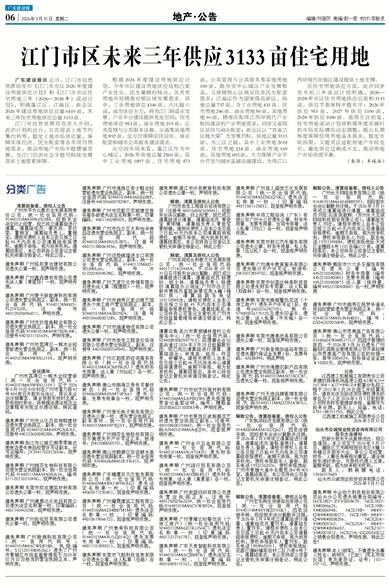 广东建设报讯 近日,江门市自然资源局发布《江门市市区2026年度建设用地供应计划》和《江门市市区住宅用地三年(2026—2028年)滚动计划》,明确蓬江区、江海区、新会区2026年建设用地供