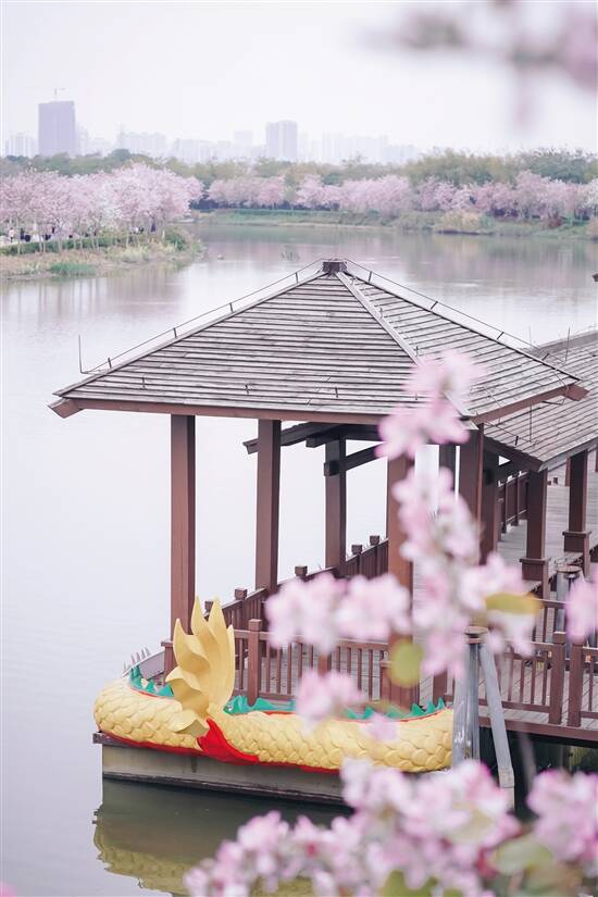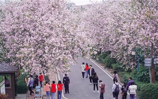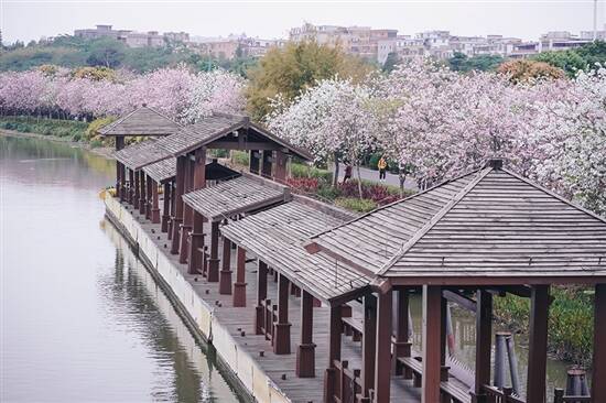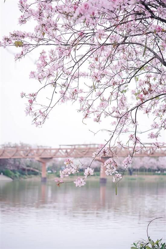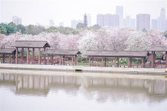 延绵3.2公里长的洋紫荆路,是海珠湿地公园最为人熟知的特色,沿着河岸一带,在二三月份盛开,极其梦幻的粉色和白色花海,置身其中会感觉到场面异常壮观。