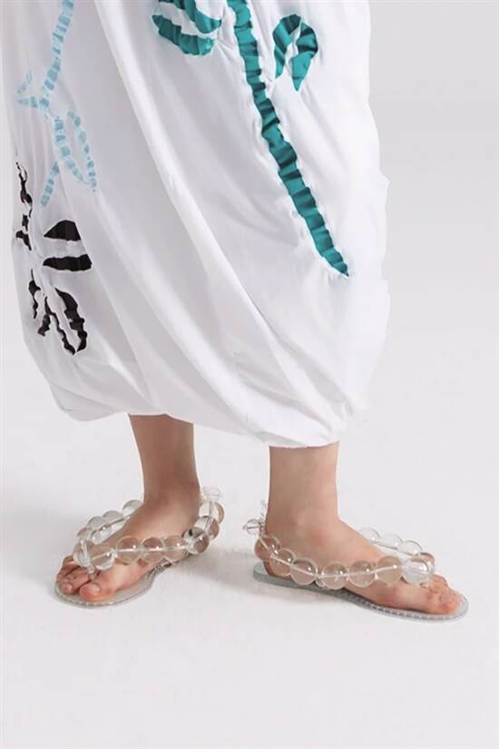 最初SUSAN FANG制作的泡泡系列透明珠子饰品,只是想要用来完善服饰系列,但是没想到面世之后受到了意料之外的追捧,才单独开发出衍生周边。SUSAN FANG除了首饰、包包,它竟然连玻璃珠子编织成的鞋子也有!主要是凉鞋和拖鞋,清透材质似有若无,像是童话故事中的水晶鞋一般,穿上就完成了你的一个公主梦。春夏时节,它会是女生的搭配好物件,搭配碎花的连衣长裙,或是休闲的T恤热裤,都能为整体造型增色不少。不过,它们的透明,也要求穿着者保养好自己的双脚,脚型、皮肤、指甲可谓一览无遗。
