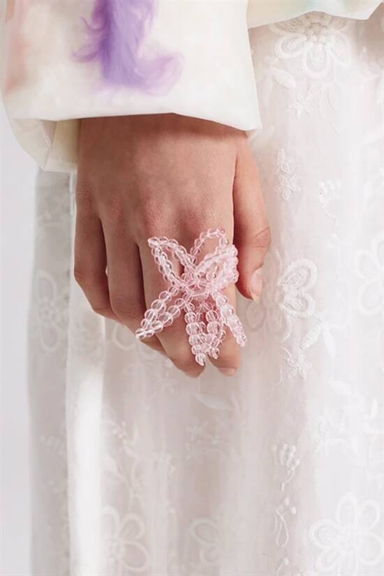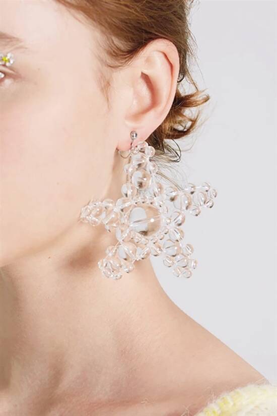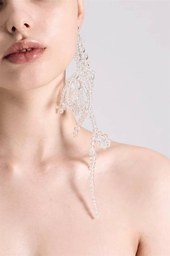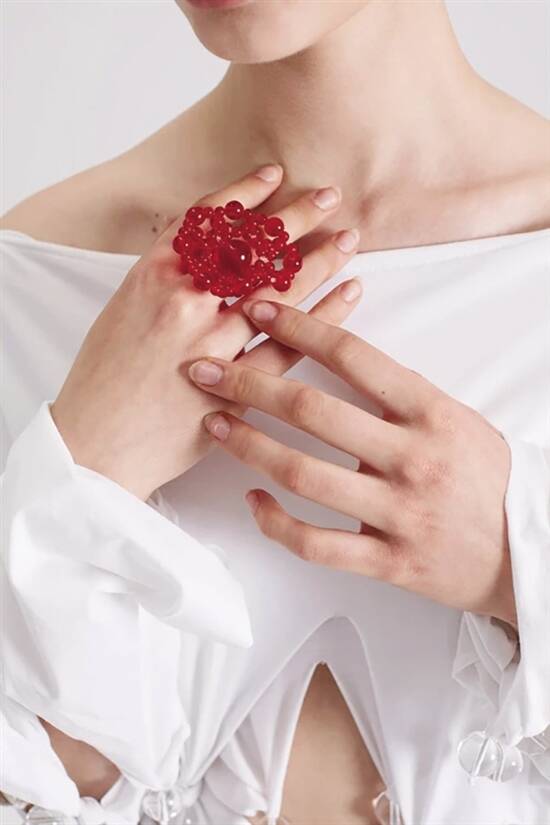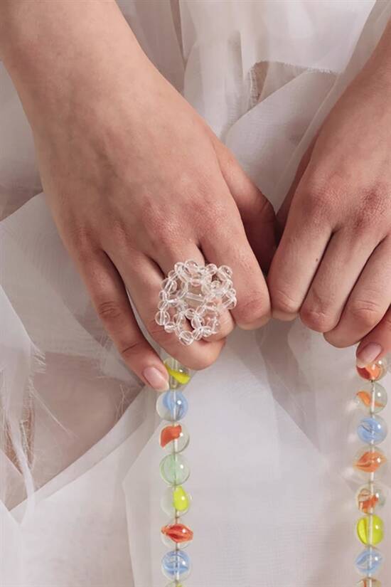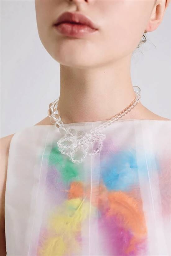 大小不一的透明玻璃珠,用独特的方式串联成不同造型,让珠子突破空间和维度的界限,有了更多样组合的可能性,赋予作品流畅立体的廓形和优雅灵动的美感。这是SUSAN FANG独有的编织技术,叫做“空气编织”。