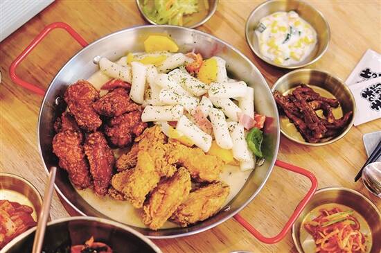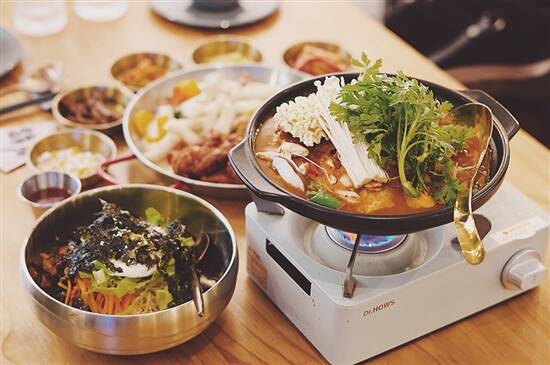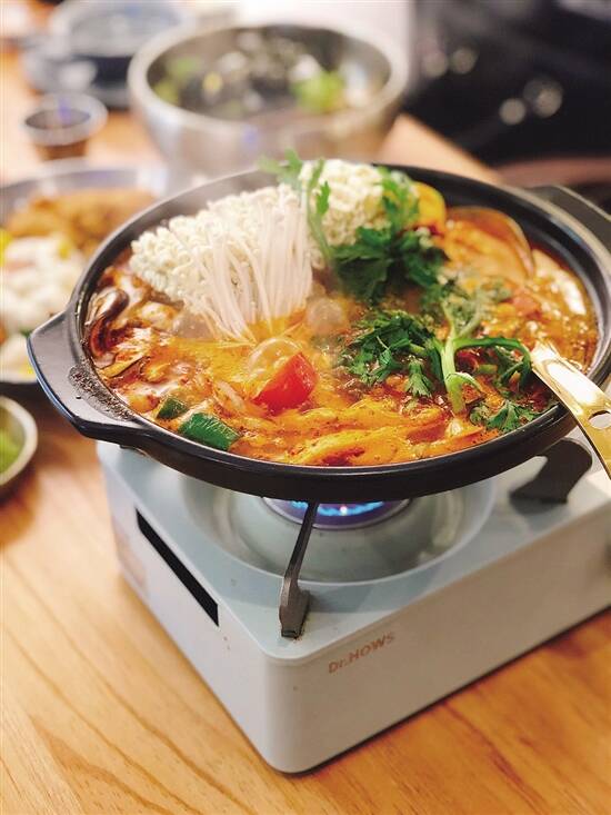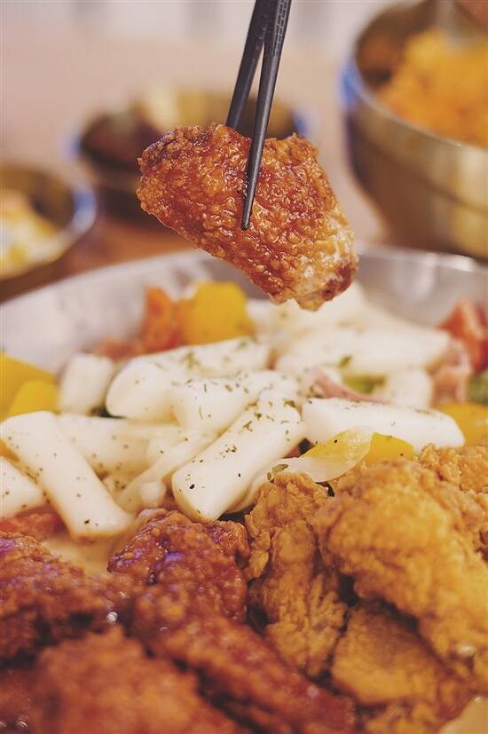 韩餐自然唔少得年糕炸鸡,呢度直接做成拼盘,炸鸡有辣味同原味双拼,一次满足你两个愿望。而部队火锅几乎每台都叫,材料超级多,有鱼饼、午餐肉、各种菌类同蔬菜,浓郁酸辣汤底配上火锅面真系食得好爽!