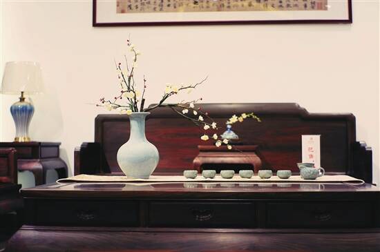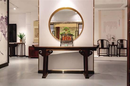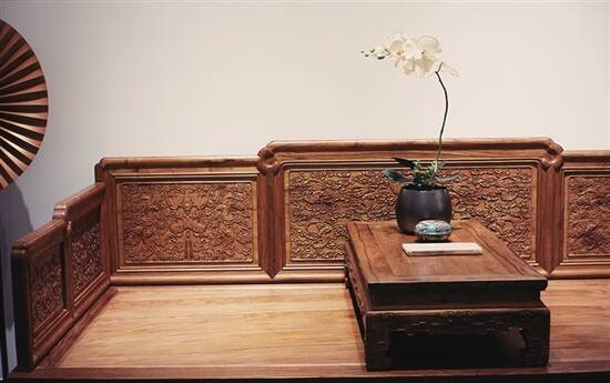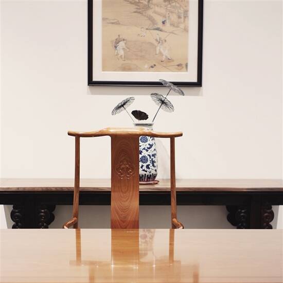 “明式”红木家具在功能上注重舒适、淳朴和秀丽,文人气质比较明显,空间要有合适的比例。搭配不一定要“全屋红木”,数量从简,选择一张椅子、一个条案等红木家具小配件作为家中的“点睛之笔”,达到实现古典与现代的平衡。风格从简,在条案、茶几上,摆放花瓶或古董,在墙壁上挂文人墨画作为背景点缀,也可以达到以少胜多的效果。