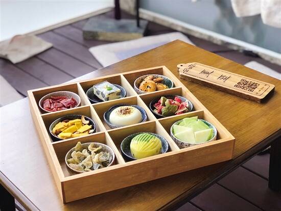 独有嘅九宫格甜品,中间三格固定係老板娘自制,分别係绿豆糕、玉子和墨染;左边同埋右边嘅三格分别係肉脯、果仁以及时令生果,这六格就会根据时令或当日推荐而更换。再配上一壶勐海熟普,唔会食到腻。唔想吃九宫格咁多,你可以试试另一款特色甜品:嫩豆球,采用低糖咸奶油,内陷分别係奥利奥饼干碎、奶油同肉松,外表撒上一层薄薄嘅黄豆粉,再加一串自制糯米丸子,有卖相又填肚!