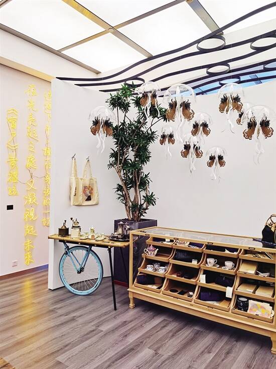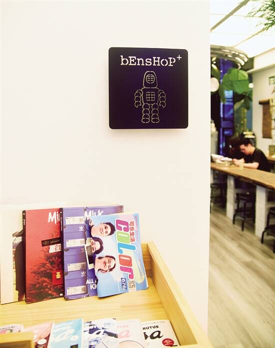 店的每一个角落都有它的故事。在扉艺术馆2层大堂那个圆弧屏风,画的是过去十五年里的bEnsHoP六家店,这里是bEnsHoP的正式入口;店的主墙上挂着的扉美术馆收藏的刘庆元作品,以及Ben揸机的拍立得照片,均靠着那部经过Ben改装升级过的永久牌限量版单车。中间两排老木桌椅延伸到尽头,是U形金纹设计的咖啡吧台,抬头是张小川的的装置作品:飞行的种子 2020,低头可以看到她设计的首饰。