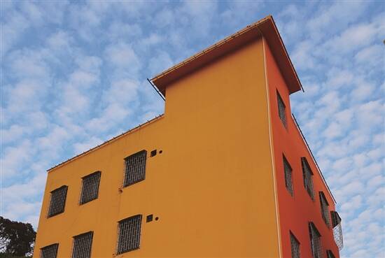 镜头多向上拍,与天空结合;选择多种色彩组合拍照;多利用建筑线条,丰富画面层次感。如果像我们这么好彩遇到大晴天,天空自带青蓝色,搭配绚丽的彩块,可以随意构建出美丽画面。